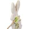 Bring a rustic and charming touch to your Easter decor with the simplistic design of this rabbit silhouette. The distressed, white-washed finish gives a vintage-inspired feel, while the brown bow embellished with a white flower and greenery adds a touch of nature. This is the perfect addition to your mantel, shelves or as a centerpiece.