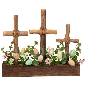 Celebrate this Easter holiday with a decoration that embodies the true meaning of it. Three crosses are implanted in a bed of artificial foliage and straw, housed in a wood-like rectangular base. Surrounded by artificial tulip flowers and speckled eggs in soft pastel colors. Wooden flowers and butterflies are strategically placed to welcome the spring season. Add a sense of renewal and create a captivating centerpiece with this Easter egg and cross decoration.