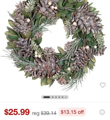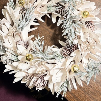 - Frosted Wooden Petal Wreath With Pinecones And Pine Sprigs
