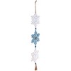 Add a touch of festive charm to your holiday decor with this delightful holiday wall sign. Three snowflakes spell out "Joy," with the middle snowflake glittered in blue and featuring a gold bead as the "O." Each snowflake is securely attached to a rustic jute rope, adorned with blue wooden bead accents. Perfect for adding a cozy, seasonal vibe to any room, this sign is a simple yet eye-catching way to celebrate the spirit of holiday.