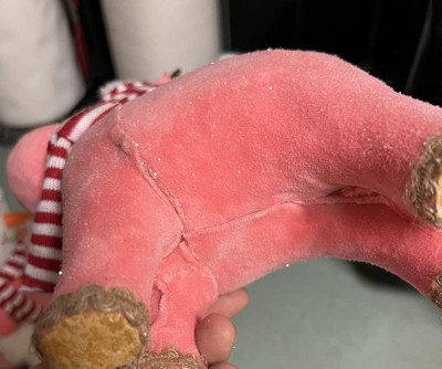 Add a touch of whimsy and winter charm to your holiday decor with our deer holiday figurine! This delightful figurine comes with a pink winter hat with white plush trim and pom-pom complemented with a red and white striped scarf, adding a cozy feel to any setting. The deer's pink fabric body is accented with shimmering iridescent glitter, while its wood twig antlers lend a rustic touch. Perfect for adorning your tables, shelves, and mantles, or as part of a festive centerpiece for your holiday dinners.