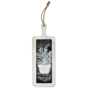 Elevate your kitchen decor with this cutting board wall decoration. Crafted with rustic charm, this sign features a cutting board design and comes complete with jute string for easy hanging. It showcases a the message "It's Spring Time" with a floral design, perfectly capturing the beauty of potted flowers. It will add a touch of nature's elegance to your home.