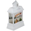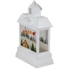 Get into the holiday spirit with this pre-lit snow globe lantern. This battery-operated lantern is designed to resemble a charming old-fashioned building. Inside the lantern, you'll discover a delightful winter scene complete with Santa Claus and his sleigh, a cozy house, holiday trees, and a jolly snowman. With its warm LED lights, this decorative piece adds a magical touch to any room or tabletop, bringing the joy and wonder of holiday right into your home.