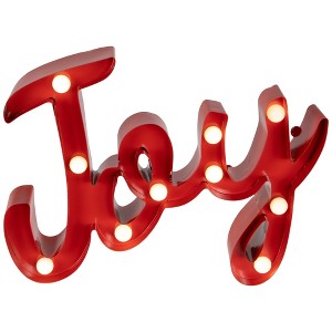Bring the festive glow of the holiday season into your home with our charming, lighted tabletop holiday sign. Crafted in elegant, metal script, the word "Joy" shines brightly in a vibrant red hue, illuminated by warm white lights. Perfect for adding a touch of seasonal cheer to any room, this delightful decoration will evoke feelings of warmth and happiness throughout the holiday season. Spread joy and light up your space with this enchanting holiday accent.