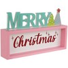 Add a touch of festive charm to your holiday decor with this lighted tabletop decoration. This delightful piece features a pretty pink frame adorned with two whimsical holiday trees flanking the word "Merry" in pastel green. In the heart of the frame, "holiday" glistens in red glitter, accompanied by a sprinkling of enchanting lighted stars. Embrace the magic of the season with this enchanting tabletop decoration.