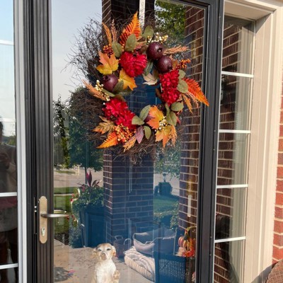 Add a touch of autumn charm to your home with fall harvest wreath. Bursting with rich hues of brown, green, red, and yellow, this wreath features a delightful medley of mums, acorns, pine cones, pomegranates, berries, and leaves. Hang it on your door or use it as a stunning centerpiece to welcome the fall season in style. Embrace the warmth and beauty of fall with this elegant and lifelike wreath.