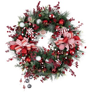 This delightful wreath brings the sweetness of the holiday season right to your doorstep. Unlit and pre-decorated with an array of red and white striped bows, vibrant ornaments, luscious berries, peppermint garland, and faux candies, it's a whimsical treat for the eyes. Whether you hang it on your front door or display it indoors, this peppermint holiday wreath will instantly transform any space into a festive wonderland.