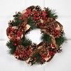 Bring rustic holiday charm to your home with this pinecone and star holiday wreath. Featuring two types of natural pinecones, real dried leaves, red glittered star-shaped wooden accents, pine sprigs, and bright red berries, it creates a warm and inviting seasonal look. The flat foam backing makes it lightweight and easy to hang on doors, walls, or mantels. Ideal for indoor use, it can also be displayed outdoors under a covered area. This wreath pairs beautifully with other seasonal decor for a cozy holiday atmosphere.