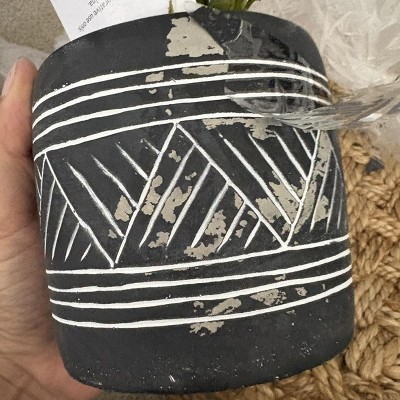 Nestled inside of a charcoal gray ceramic pot with a white Aztec pattern