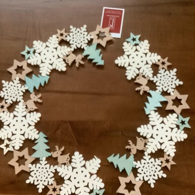 Add rustic charm to your winter decor with this 15.75" one-sided flat-back dual-layer wreath. Crafted with intricate wooden cut-outs, this wreath features white snowflakes, natural wood-hued reindeer, pastel blue pine trees, and wooden stars. It comes fully assembled with a white hanging cord for easy decorating on doors, mantels, and walls. The unfinished natural wood back invites creative customization with glitter, paint, or ribbon bows, making it a fun DIY project. Ideal for snowflake-themed, rustic, or traditional winter decor.