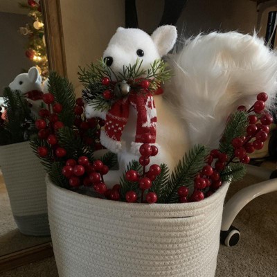 This endearing sitting squirrel holds a frosted pinecone in its paws that has fallen from his favorite tree. Winter-ready, he is dressed in a festive red and white, striped reindeer scarf with plush trim. Adorned with pine sprigs, red wild berries, and a jingle bell, this figurine exudes seasonal cheer. This squirrel figurine adds a whimsical touch to your tables, shelves, and mantels. Embrace the season's spirit with this charming accent piece that will spark joy and conversation among your guests.