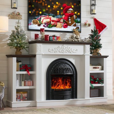 • This fireplace TV stand can hold up to a 32-inch flat screen TV or serve as a mantel for books, pictures frames, artwork, and holiday decor