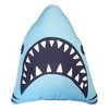 - Comforter features multiple sharks on navy background with white shark fins reverse; sheets are light blue with white shark fins; shark head shaped decorative pillow