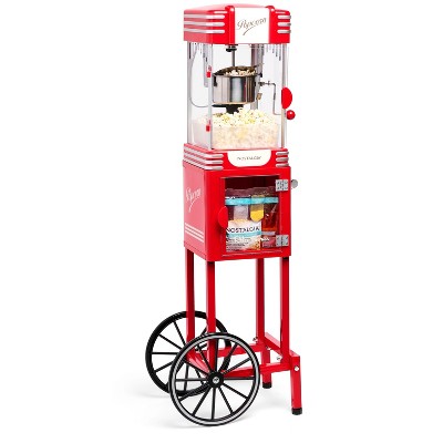 With a vintage look reminiscent of silent movie houses and carnivals of the 1900s, this cart is a classic addition to any home. Featuring a large 8-ounce kettle with built-in stirring system, this unit pops up to 32 cups of delicious popcorn every time. Tempered glass windows and door, along with interior light, lets everyone watch each delicious kernel pop to perfection. A convenient utility shelf is perfect for popcorn preparation. Plus, keep all your popcorn essentials on hand in the convenient storage compartment. If floor space is an issue, the top removes from the base for countertop use.