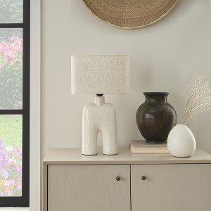 This unique lamp boasts an artful ceramic base with a natural, organic silhouette, paired perfectly with a neutral beige shade. Its speckled off-white finish adds a touch of rustic charm, elevating its contemporary design. Place it atop a sideboard or console table to infuse your interior with both illumination and style.