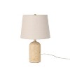 Elevate your decor with the natural beauty of this neutral table lamp. Featuring a timeless, small travertine stone base, this lamp brings earthy tones and organic textures into your decor. Each lamp is unique, with individual stone variations that add character and charm. The design is elevated with subtle brass accents, adding a touch of sophistication. Paired with a warm beige fabric shade, it creates a cozy, ambient glow, perfect for enhancing living rooms, bedrooms, or reading nooks.