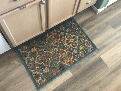 I had been searching for a rug for in front of the kitchen sink. I wanted something that incorporated all of my decor colors in transitional/traditional pattern AND would hold up well for kitchen use. I also was looking for a specific size and price point. This rug ticked off all the boxes! The color is true to the online photo, the edges are well bound, the pile is just the right height for the kitchen, and it flattened out to lay very nicely (I would recommend something underneath to keep it from sliding) I don’t recall if Target’s listing specified this information, so for anyone wondering: this rug is made in Turkey and is 100% polypropylene.