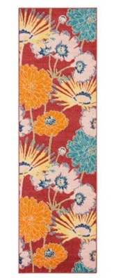 For a couple of weeks, I was debating purchasing this beautiful Allur Red Rug Runner online through my local home products store. I had really wanted this very rug but with a lime green background color. I couldn't make up my mind from the excellent varieties with red being #1, followed by turquoise and then yellow both being #2 choices. I finally asked my sister who has a strong art background to see if she agreed with me on the red as my choice. She was immediate in her response on how much she loved the red one and yes, buy it! I decided to actually buy 3 runners for dining room entry, hallway, and living room. There is one thing I noticed about the floral pattern! Two of my rug runners have the print pattern in the same places; however, the third rug runner has a mirror image of the pattern. If you look at my four review photos, you see the hallway and dining room runners are different! The two deep turquoise flowers should be on the right, but in the one runner, they are mirrored and on the left. I didn't notice that at first but decided to take the hallway runner and put it in the living room and have the two "matching" runners in the dining and hallway as you notice those when you first come into my house. I really love the colors and flowers and would be thrilled to see this in a shower curtain, sheets set, or comforter set! Quite striking. You know, it is so pretty and artsy, that you almost don't want to walk on the rug runners but hang them up on the wall like an art tapestry. Bravo to the artist you created this pretty floral pattern ... and in the colors ... now how about lime green in another choice!