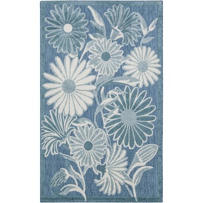 In swirling vines and flowers of blue and ivory, this Aloha outdoor rug complements your patio, porch or poolside setting. A high-low weave combines textural patterns with an intricately woven base for exceptional look that stands up to the elements. Machine-made from premium stain-resistant fibers that are easily washable with a hose: simply rinse and allow both sides time to fully air dry.