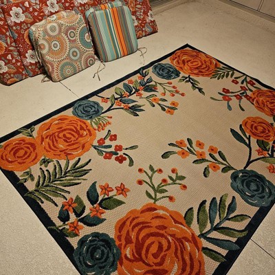 I recently purchased the floral border outdoor rug for my patio and I couldn't be happier with my choice! The vibrant floral border adds a touch of elegance and color to my outdoor space. The colors are bright and not muted. The rug also feels soft underfoot, which is a pleasant surprise for an outdoor rug.