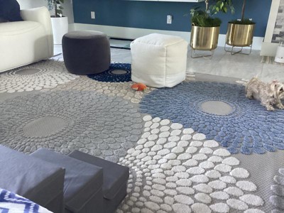 Bought this for our patio and I absolutely love it. The colors are so vibrant. It’s very soft to walk on. We tried it in our family room because it’s in navy, yellow and white. We are going to order the 7 x 10 for it. You won’t be disappointed.