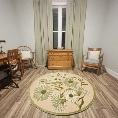 I bought this rug in hopes that it would match my outdoor decor and it is perfect, it is soft not like most outdoor rugs and the daiseys are just the right touch for the warm weather.