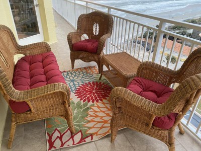 I recently purchased the floral border outdoor rug for my patio and I couldn't be happier with my choice! The vibrant floral border adds a touch of elegance and color to my outdoor space. The colors are bright and not muted. The rug also feels soft underfoot, which is a pleasant surprise for an outdoor rug.