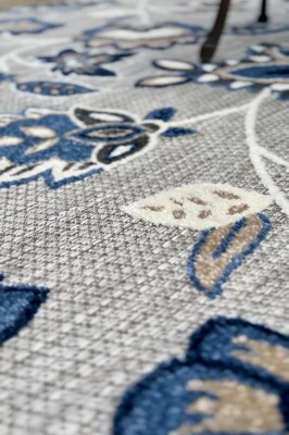 - Floral indoor/outdoor area rug in neutral grey, blue, and ivory