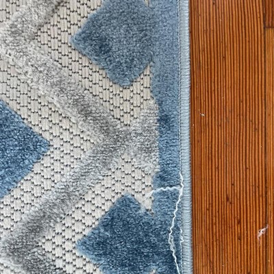 The quality is little poor. The seams are unraveling around the edges. Very thin — will definitely need a rug pad. I’m not sure how this would hold up with spraying with a hose actually. I guess we’ll see!