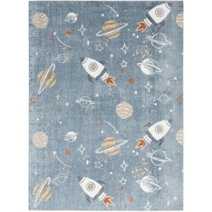 Fuel your child’s love for imaginative play with this blue kids rug from the Astra Machine Washable Collection. The repeat rocket and planet design is finished with a brilliant shimmer that adds a fun pop of color to a playroom, nursery, or kids bedroom. Cleaning up accidents is a breeze – simply toss the rug into the washing machine on cold and air dry. OEKO-TEX certified.
