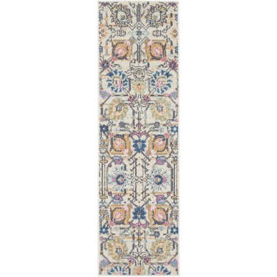 Brighten up your favorite space with this boho accent rug from the Rosedale Collection. Featuring a Moroccan Berber pattern in vibrant shades of blue, pink, and yellow on an ivory ground, this textured rug adds a bold pop of color to your hallway, entryway, bedroom, or living room as part of a layered rug look. Machine-made from durable, hand-washable polyester.