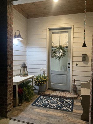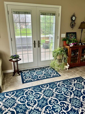 I purchased this rug in several sizes for my kitchen area. The rug colors look great with my navy island and wall paint color! The rug is made well and provides a finished look for my newly renovated kitchen.