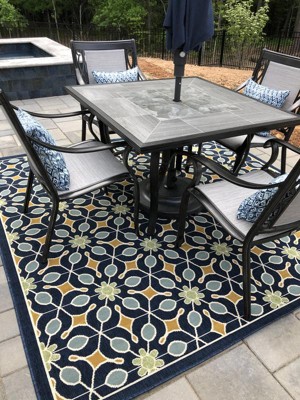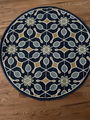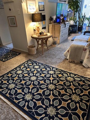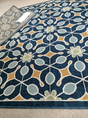 The crisp contrast of beige on navy blue injects a contemporary energy into this Caribbean Collection indoor/outdoor rug. The elegant floral patterns and arabesques create a regal touch for any lively outdoor lifestyle.