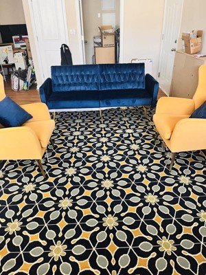 I'm redoing my living room in Mid Century Modern and this flower/geometric pattern says Retro! I was concerned t that the rug wouldn't look appropriate indoors, being that it's an indoor/outdoor rug. It looks fantastic and luxurious! I love the compact weave and ease of maintenance. The colors are exquisite too! Though what looked orange to me in the photos are actuallya beautiful gold. The green is a pale sage. Blue is Crayola's cornflower blue. The dark blue is actually a brindle of navy and royal blue that adds to the richness, and you can see it only when you're close up. I love the navy border also, and I'm glad that the pattern doesn't go all the way to the edges. Again, adding to the rich quality of this rug. I am very pleased with my purchase! 10 stars