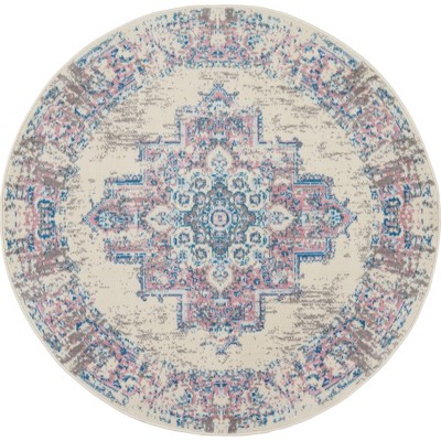 The description and photos are misleading. Our Ivory/gray rug had bunch of blue/purple mixed in. The exact opposite of what people want when they look for calm shades. Returned.