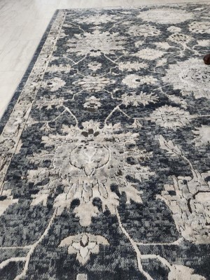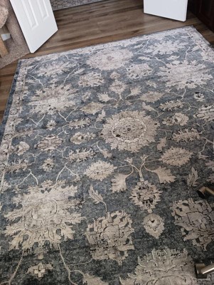 This rug is even more beautiful than the pictures present. It works perfectly with our light colored couches and flooring. It arrived folded and within a few minutes it was lying flat (no rolled up edges - Yay!). The rug is thinner than the other rugs I have, so I ordered a 1/2 inch rug pad (from another source) for added cushion. Very happy with this purchase especially for the price. Highly recommend it. The colors are slate blue, gray, navy, taupe, and some black.