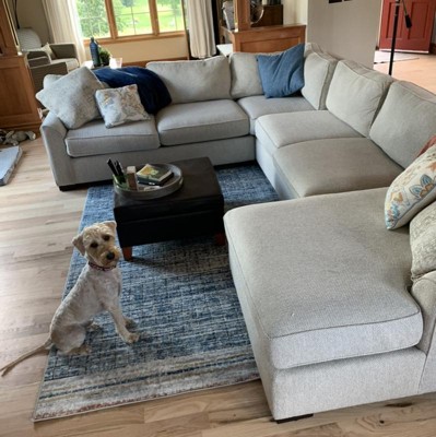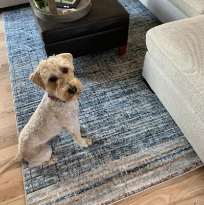 Great area rug for the price. Very low pile. Pulls together my living room very nicely. Dog loves it and wouldn’t get off it even for the picture! Colors are true to picture (navy/white/beige/ rust/dark gray).