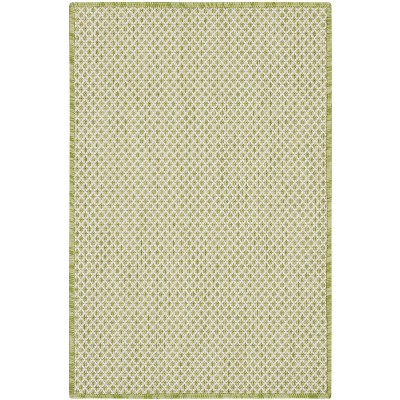 With its striking geometric pattern, this Courtyard Collection outdoor rug exudes contemporary style. Its subtly textured surface is crafted in classic ivory and green for a seamless complement to modern settings. Machine made from a blend of polypropylene and polyester in a flatweave style that stands up to heavy traffic. Easily washable outdoors: just hose-rinse and air dry.