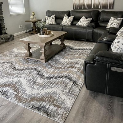 - Abstract area rug design in cool grey, deep red, ivory, blue, and rust orange hue create movement in modern and contemporary decor