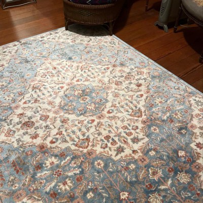 A nod to traditional Persian designs, this area rug from the Elation Collection is reinterpreted for the modern age. Classic floral and diamond patterns are rendered in soft blue and ivory for an elegant foundation in farmhouse, boho chic, and contemporary decor. Machine made of polyester and polypropylene in a low-profile, easy to clean pile, it's an ideal choice for high traffic areas.