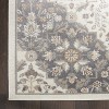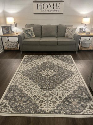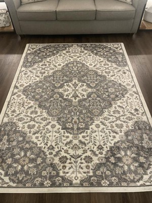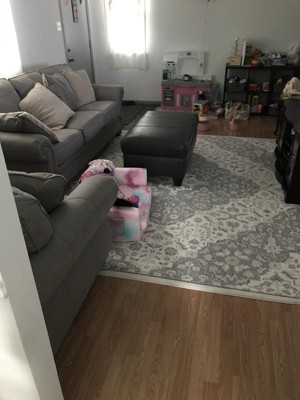 A: Hello, This rug features classic floral and diamond patterns rendered in grey and ivory for an elegant foundation in farmhouse, boho chic, and contemporary decor.