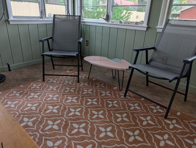 Really like this rug! The morrocan prints adds a touch of class to my patio. I bought this in the navy color so the design contract is very pretty. Will also be easy to clean due to the color and low pile height.