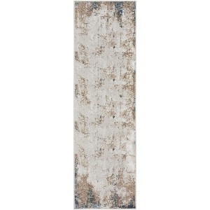 Add chic style to your living room or bedroom with this abstract rug from the Glam Collection. Featuring a modern distressed pattern in taupe, blue, and grey multicolor, this modern rug is enhanced with an eye-catching sheen that shifts in tone under different light. Made from easy-clean, softly textured polyester.