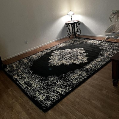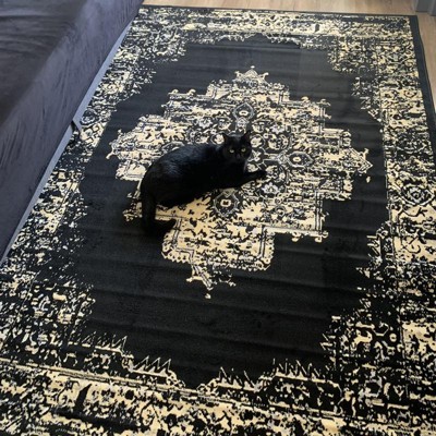 I got the 7x10 rug in black and Omg I LOVE it ! It’s so soft and it’s design fits just perfect for my library living room I’m designing . The color is very rich and it has no smell . The corners don’t lift either but I still weighed it down. Came fast and way ahead of schedule . Would absolutely recommend seller