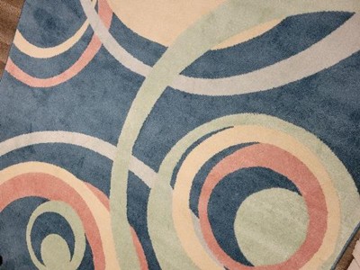 Our rug of grey , cream & blue match our living room decor as it would most any. The circle pattern that stream through calls attention to it's beauty and the soft feel, as well as it's great stylish looks.