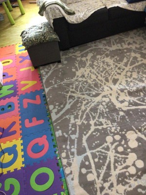 Nature and abstract combine in this dramatic forest-inspired design from the Jubilant Collection by Nourison. Silhouetted limbs in ivory and pale blue spread across a grey field of low-pile, easy-care fibers, creating an instantly engaging artistic rug that will energize any room in the home.