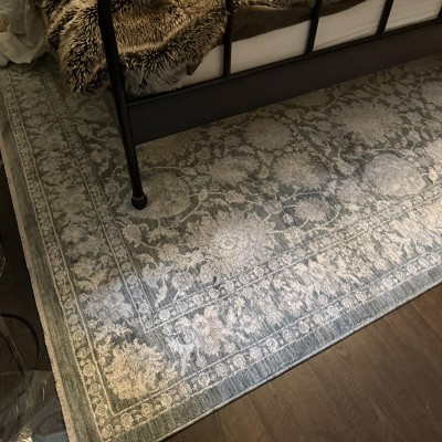Refresh your space with the refined charm of this vintage-style sage rug from the Outlines collection. The classic Persian floral pattern and coordinating border, finished with short fringe at both ends, creates a distinguished look for any room. This traditional rug is made from 100% polyester with an incredibly soft texture and easy-clean construction perfect for busy households with pets and kids.