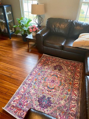 I have been considering purchasing this rug for my bedroom for over a year and I’m so glad I finally did! The price is unbeatable and the colors are stunning. Such vibrant pinks and yellows. I got an 8x10 to go under my queen bed and it fits our room perfectly. Like other reviews said, it does need to air out for a bit, but after a few hours the smell was completely gone. If you don’t plan to have this fixed in place by furniture, you may need a rug pad to keep it from slipping.