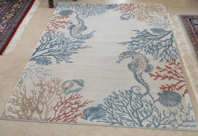 Seahorses and shellfish float dreamily amidst seagrass fronds in this nautical rug from the Pompeii Collection. Give a relaxed seashore look to your living room, home office, or bedroom ... and let your cares drift away with the currents! Softly muted tones of red, blue and sand on ivory have a fresh, contemporary feel. Finished with a high-low cut pile for added textural appeal.
