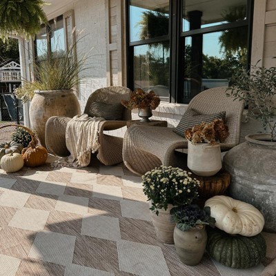 - BOLD STYLE: The oversized checkered diamond pattern of this outdoor rug adds an instant wow factor to your décor.